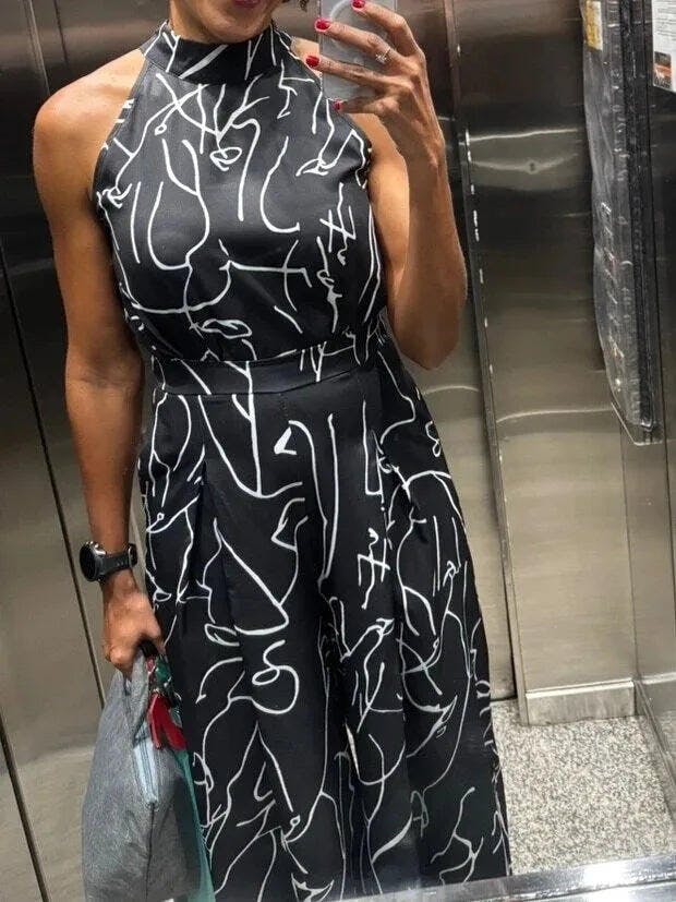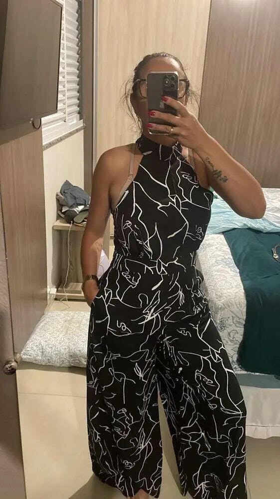 Eleve seu estilo com este Macacão Frente Única Estampado da SANTALUX. O modelo apresenta estampa abstrata sofisticada em preto e branco, amarração no pescoço e modelagem pantalona que proporciona conforto e elegância. Com costas abertas e cintura alta, é perfeito para passeios, férias e ocasiões casuais, combinando praticidade com visual moderno.