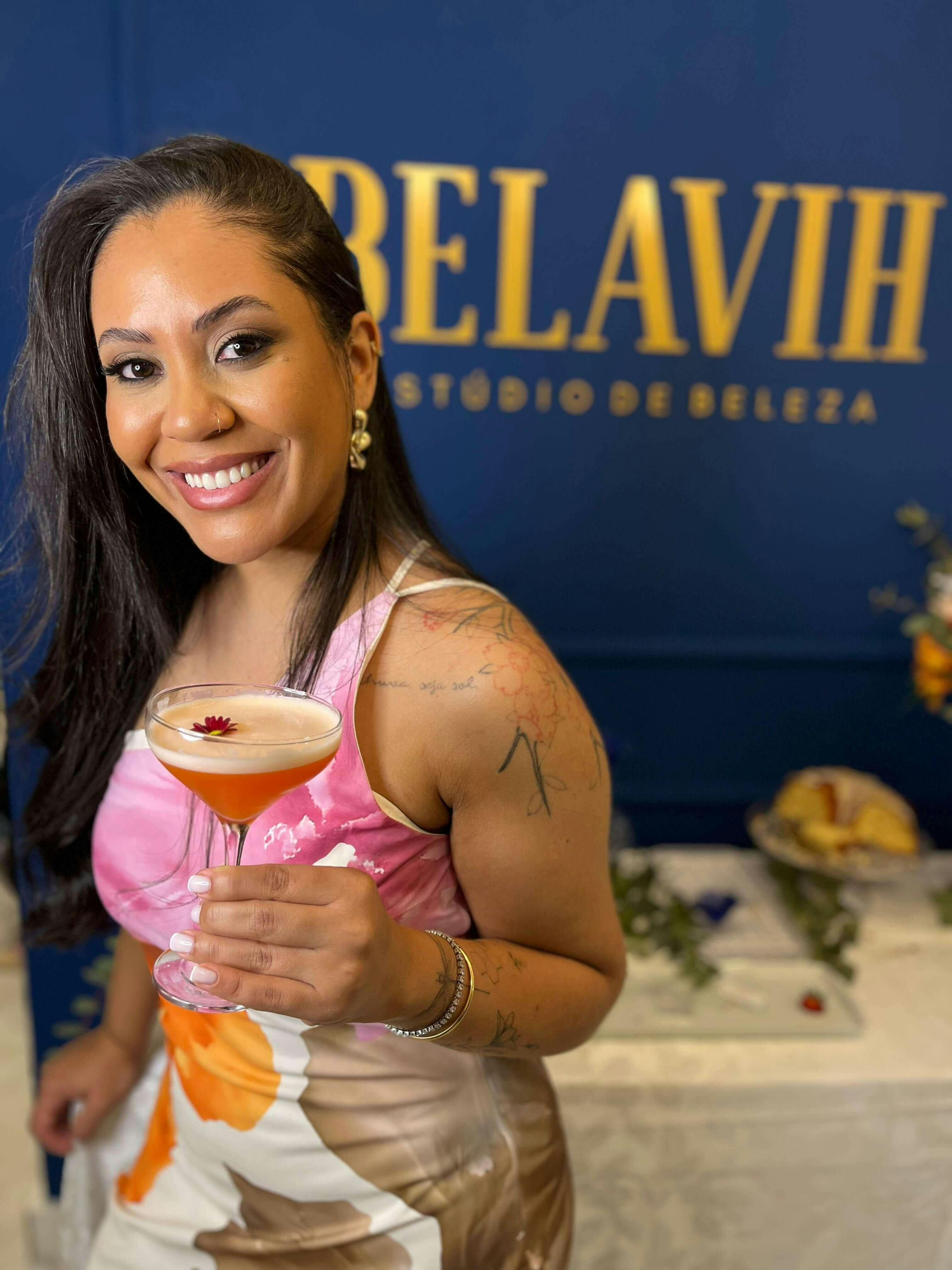 - Fundo off-white com estampa floral aquarelada e exclusiva – flores em tons de verde, laranja, rosa e nude