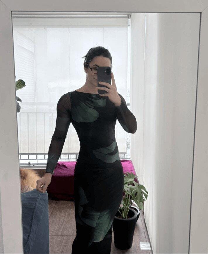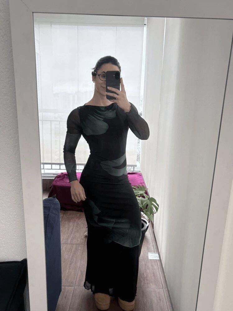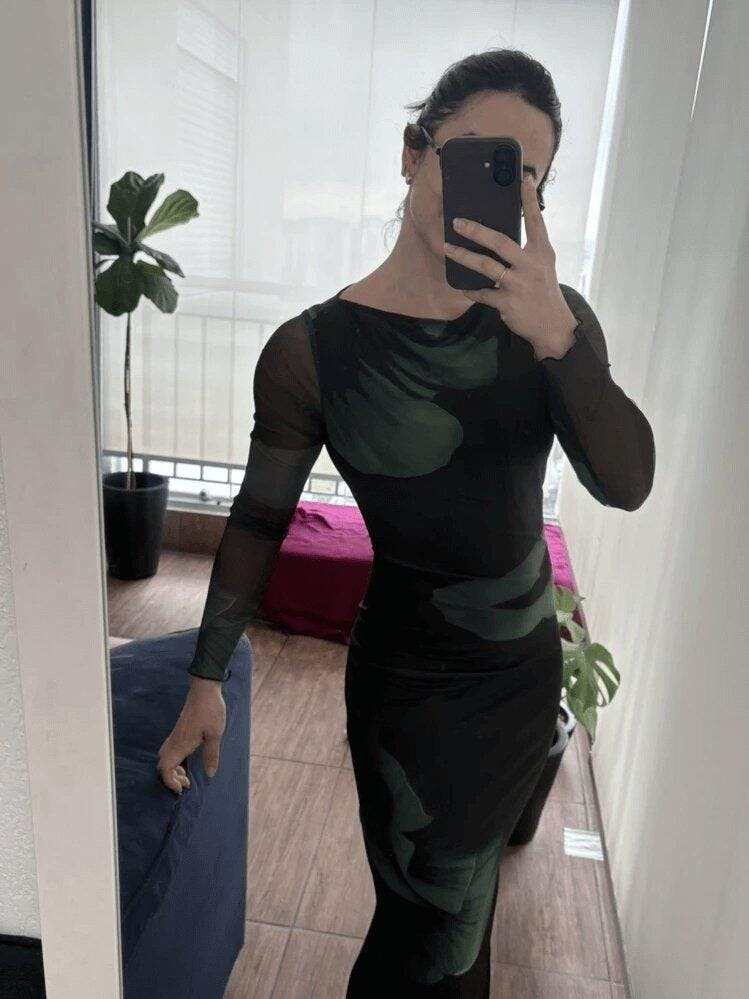 - Modelagem: Midi ajustada com manga transparente que realça a silhueta